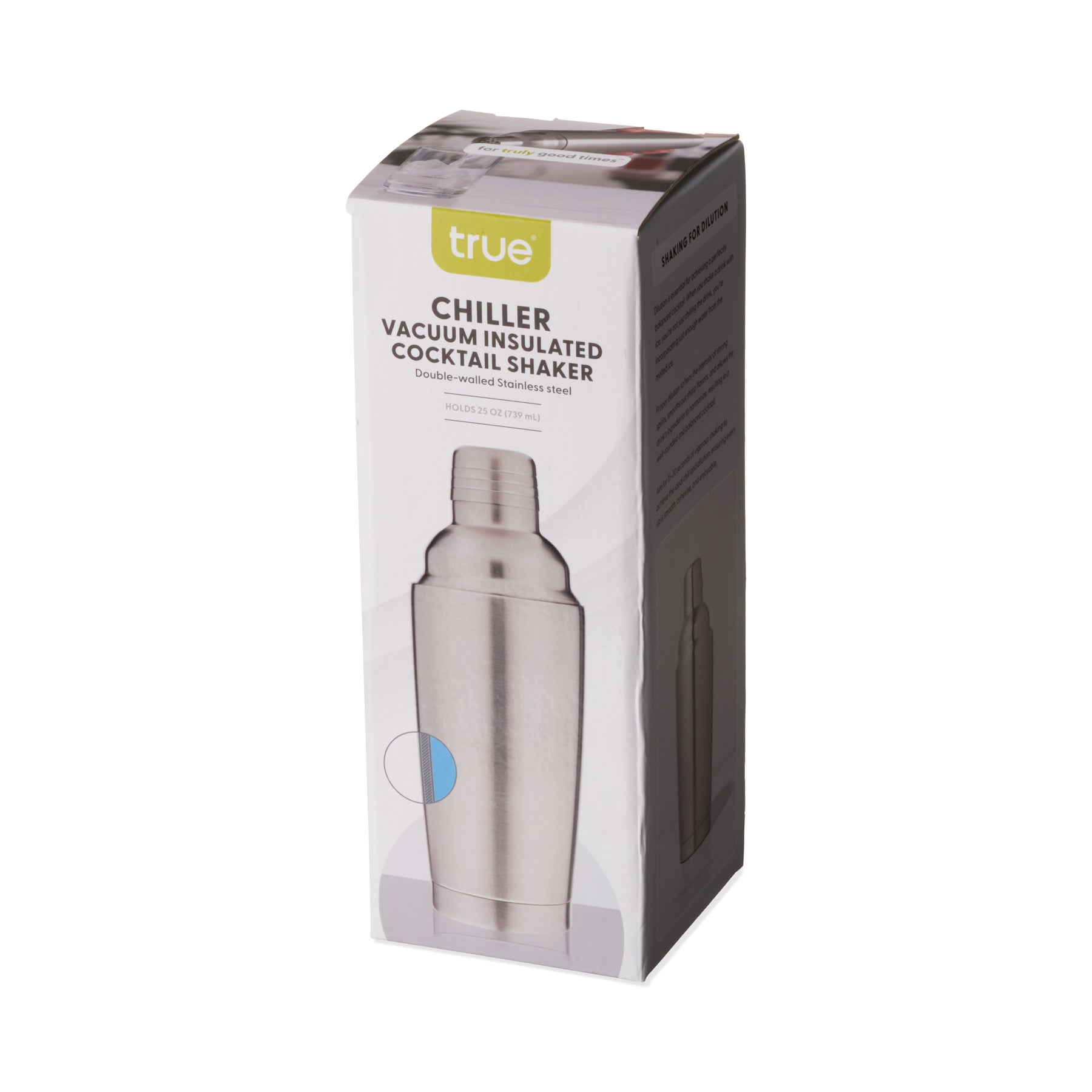 Double walled and vacuum insulated, this stainless steel cocktail shaker prevents condensation and chills cocktails more quickly while keeping your hand comfortable.
