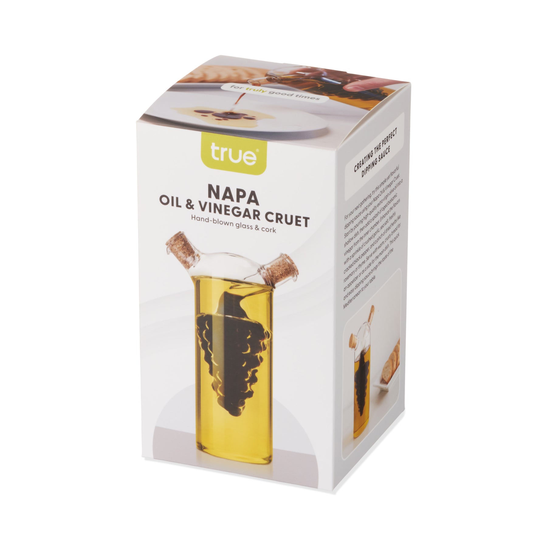 Elegantly crafted, this hand-blown Napa Oil & Vinegar Cruet features a dual-chamber design. The outer glass vessel holds olive oil, while the inner glass grape cluster preserves rich vinegar. Easily pour from either side to dress salads, dip bread, or drizzle over your favorite dishes. With its distinct aesthetic, this cruet doubles as a stunning centerpiece for your table.