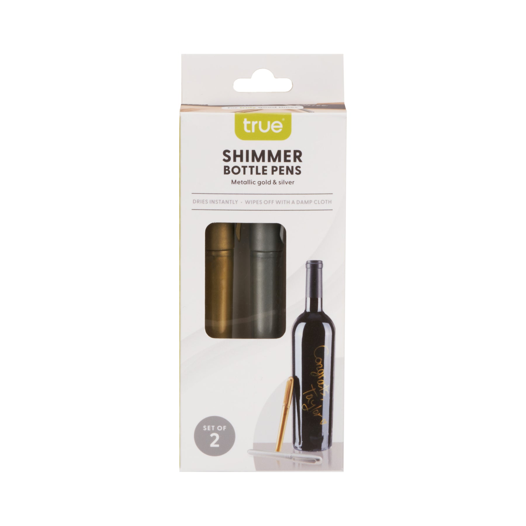 Make every bottle uniquely yours with the Wine Pens set, featuring two shimmer metallic pens in silver and gold. These pens are perfect for personalizing bottles, labeling glasses for tastings, or adding a special touch to gift presentations. Designed to write smoothly on bottles and glassware, they dry instantly and wipe off easily with a damp cloth.